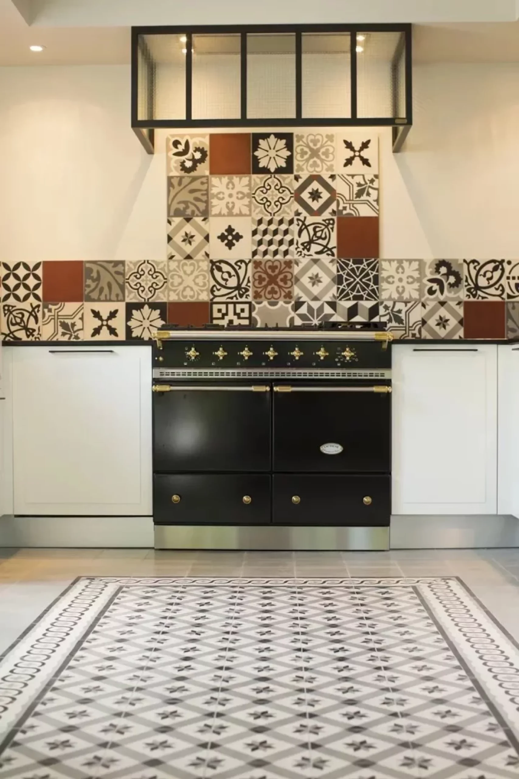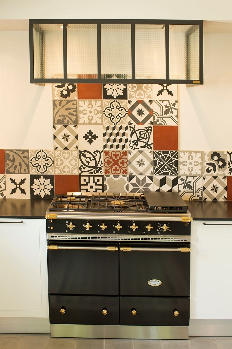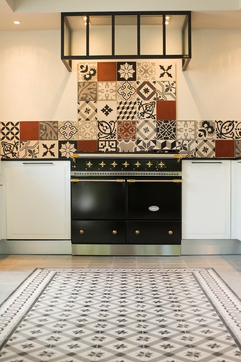 Cuisine façades placage bois brossé laqué blanc – Plan de travail granit noir brossé – Crédence carreaux de ciment – Cape de hotte avec verrière – Sol en carreaux ciment