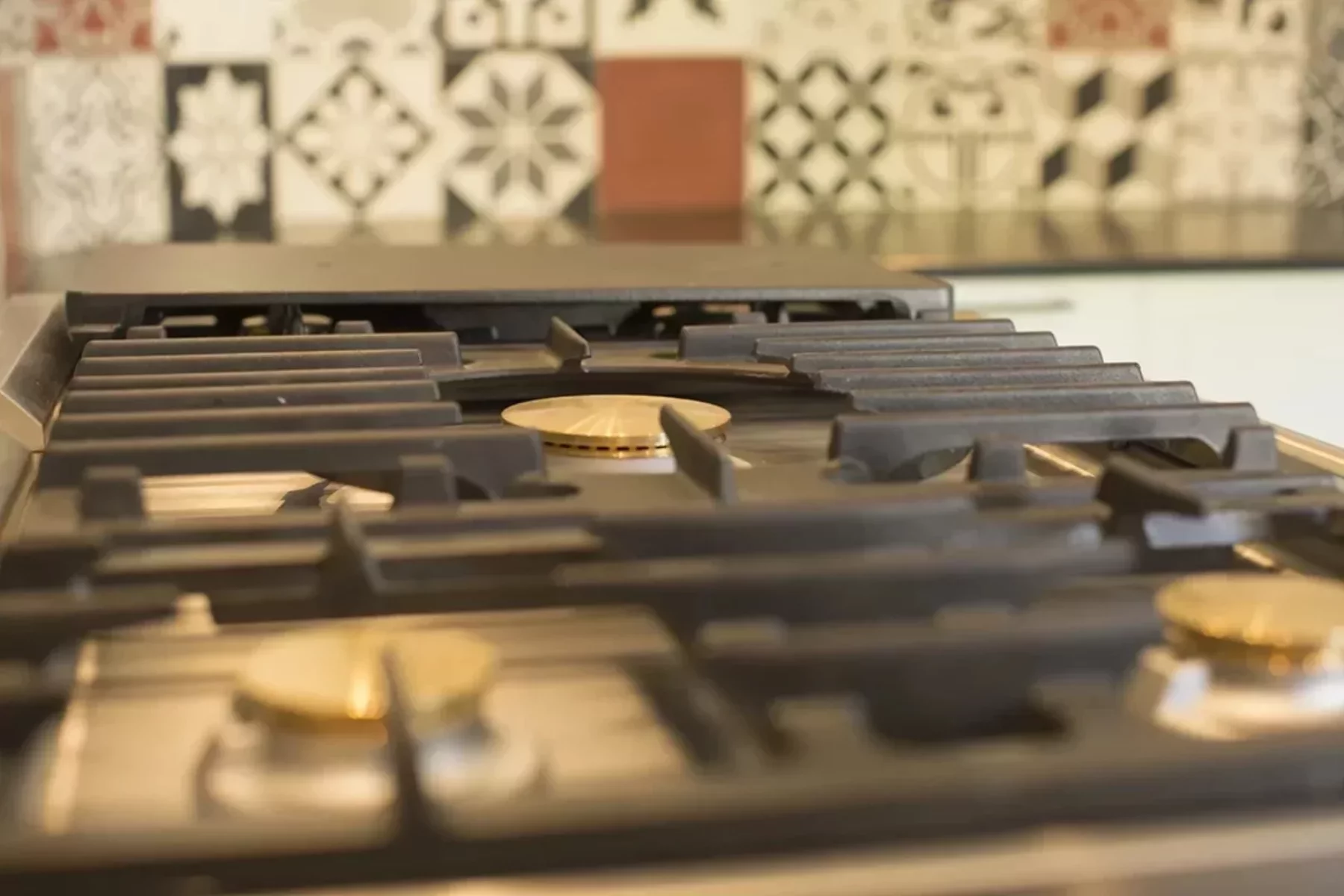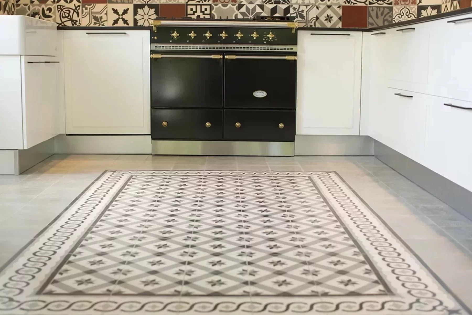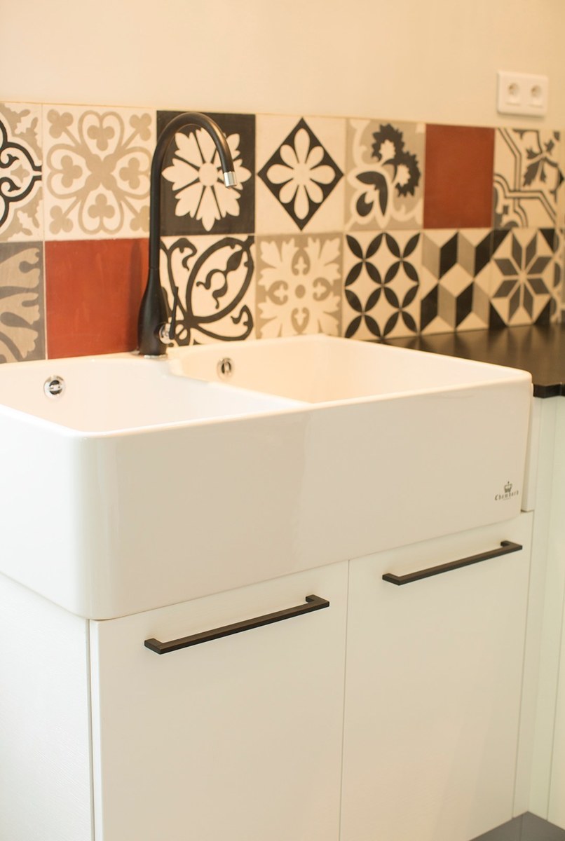 Cuisine façades placage bois brossé laqué blanc – Plan de travail granit noir brossé – Crédence carreaux de ciment – Cape de hotte avec verrière – Sol en carreaux ciment