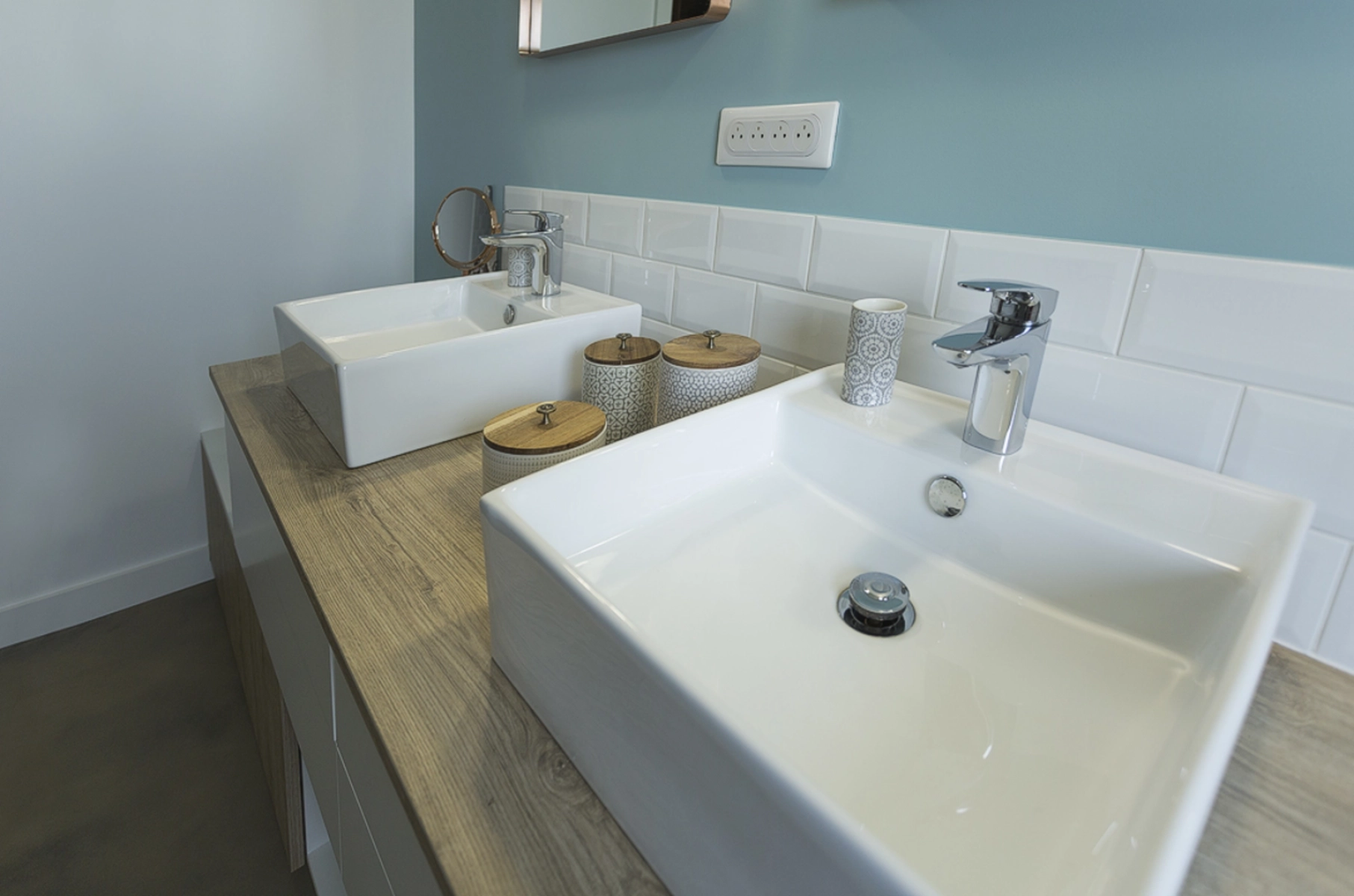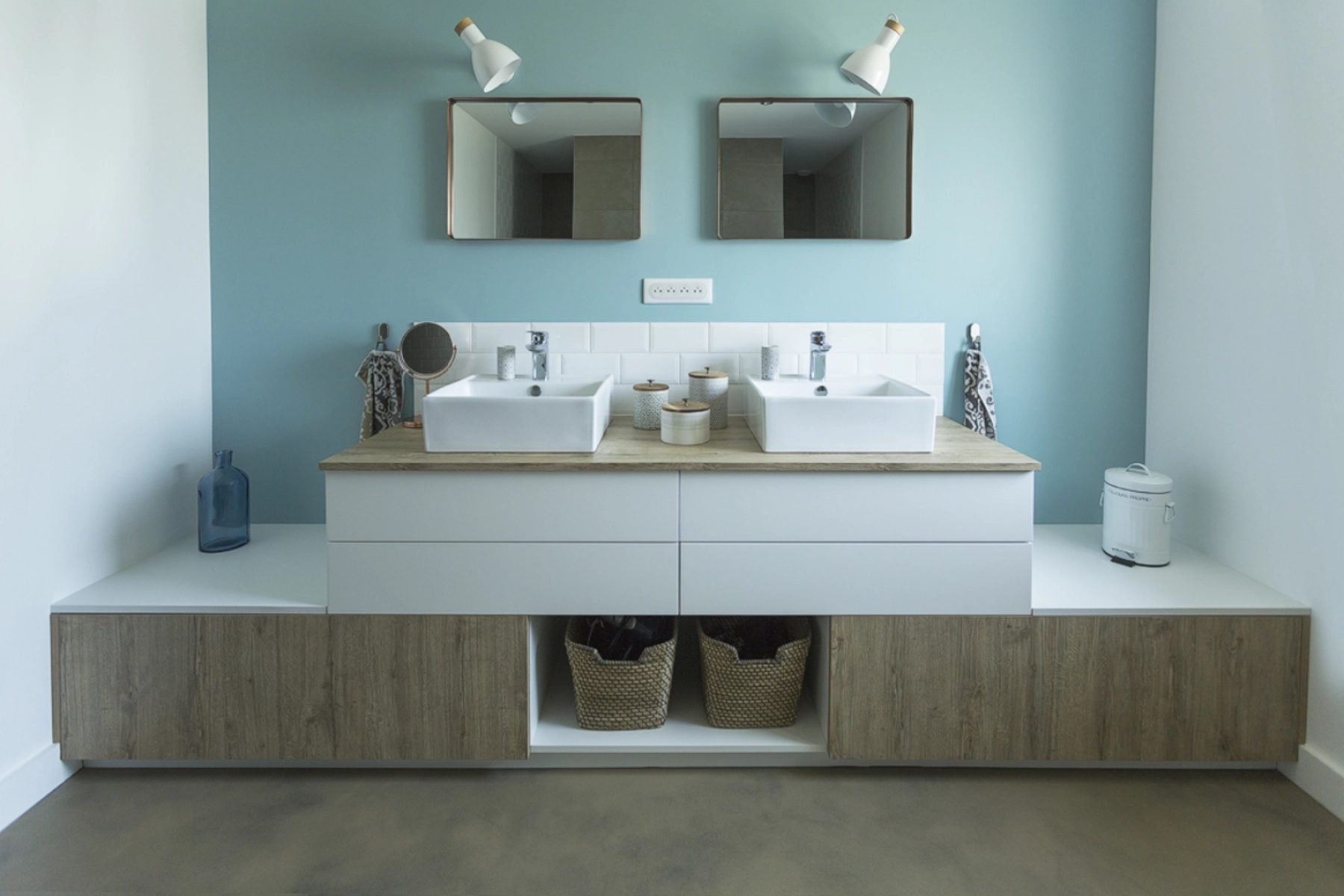 SALLE DE BAIN MÉLANGE ENTRE BLEU TURQUOISE, BOIS ET BÉTON