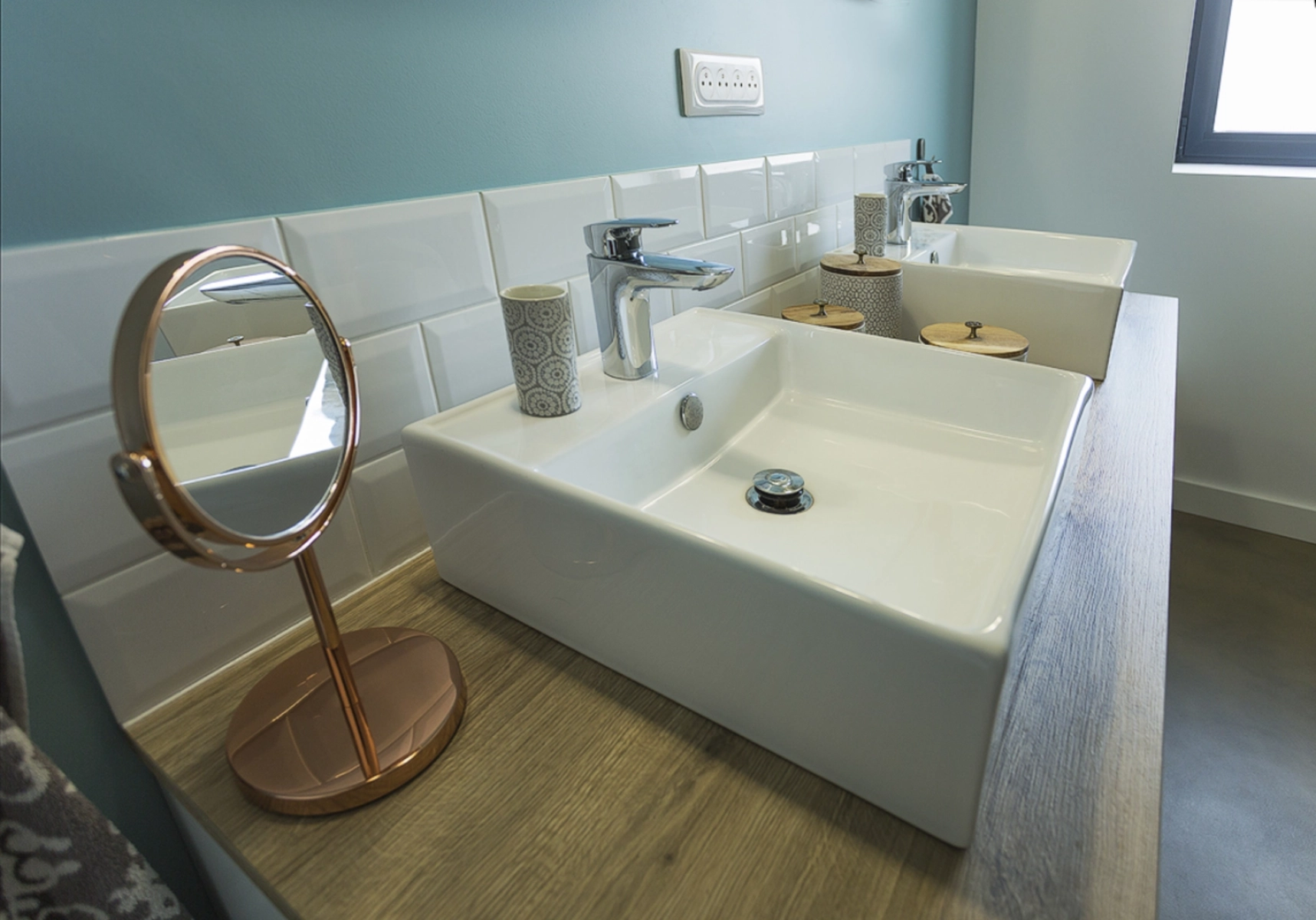 Une idée originale et relaxante, la salle de bain couleur bleu turquoise. Cette couleur associée avec le bois donne un aspect très chaleureux. Contactez Artiplan à Mâcon pour réaliser la salle de bain de vos rêves !